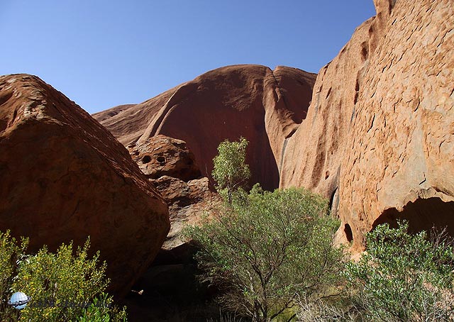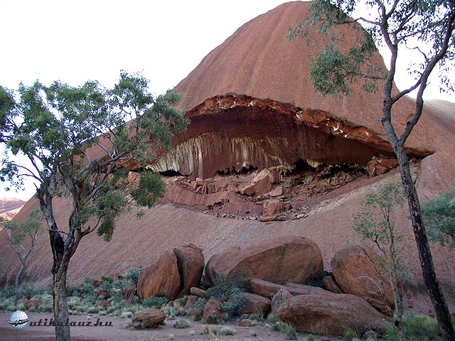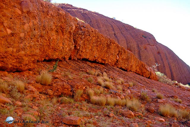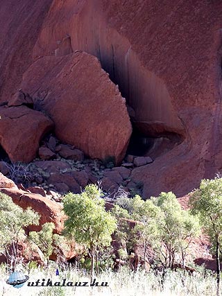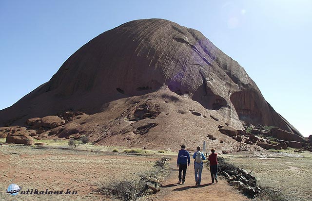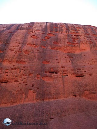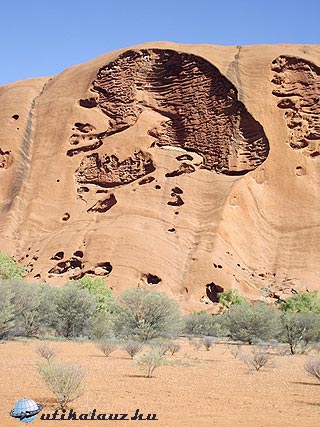 Viszont körbe lehet sétálni a Sziklát, ami 17 km. A terület ugyan lapos, de sok helyen meg kell állni a változatos látnivalók miatt. Mire körbeértünk ránk is esteledett. A Szikla minden irányból más arcát mutatja, a többórás séta egy percig sem unalmas. Az erózió itt-ott igen érdekes felületi képződményeket produkált, amikbe mindenki azt képzel bele amit akar, bár az egyik kifejezetten egy emberi koponyára emlékeztet.