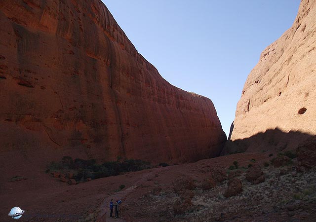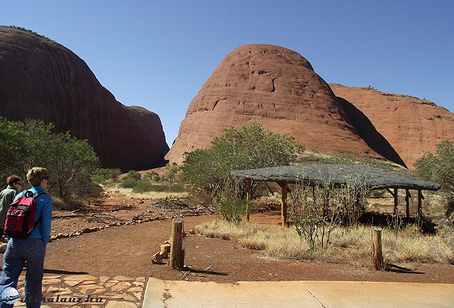 Ez a sziklacsoport, hasonlóan az Uluru-hoz, szintén minden átmenet nélkül emelkedik ki a félsivatagos környezetből. A hasonlóság itt véget is ér, mert ez a sziklacsoport – inkább hegy vagy dombcsoportnak nevezném – alaposan szétdarabolódott dombok sokasága. Ez a szétdarabolódás ugyan már az Ulurun is elkezdődött, de itt lényegesen előrehaladottabb állapotban van. Rögtön a megérkezés után elindultunk az első kanyonba, amit szinte merőleges sziklafalak vesznek körül. Kegyetlen hideg szél fújt, alaposan fel kell öltözni. Általános tanács – saját példám alapján: ebben az időszakban minding legyen nálunk meleg ruha, mert bár a napon kellemes az idő, amint árnyékba vagy szeles helyre kerülsz, igen kellemetlen meglepetés ér és komoly meghűlésre van kilátásod. Nagyon erős, minimum +35 napolaj, széles karimájú kalap és napszemüveg szintén ajánlott. Fényképezni nem könnyű, mert az egyik oldal a szikrázó napsütésben túlexponált lesz, a másik árnyékos oldal alulexponált marad.