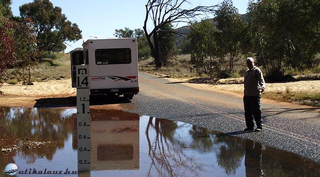 A nap már igen alacsonyan állt mire visszaértünk a kocsihoz. Mivel a következő uticél Alice Springs volt, nem sok esély volt aznap odajutni. Elindultunk visszafelé azzal az elhatározással, hogy ahol ránksötétedik, ott megalszunk. Nem kellett sokat várni, ebben az időszakban fél hétkor már lemegy a nap. Szerencsére elég sok pihenőhely van az országút mellett, ahol mindig van alkalom tűzgyújtásra és egy esővíztank is rendelkezésre áll az edények elmosogatására. A nagyobb helyeken pottyantós WC is van, szerencsére nekünk volt WC a kocsiban.