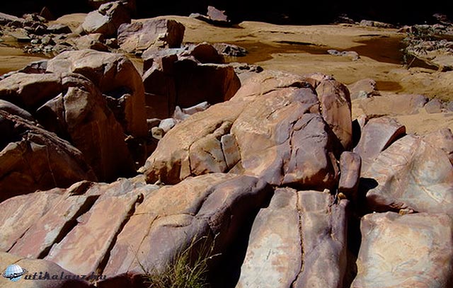 Indulni kellett, a túra nagyobbik része még hátra volt. Ismét fantasztikus környezetben haladtunk. A sziklák formája és színe lépésről lépésre változott. Egy részen például a kanyon alján fekvő kövek határozott lilás színben pompáztak. Pár lépésre a sziklák szabályos kockákra töredeztek, mintha utcaköveknek készültek volna. Persze némelyik több méteres volt. Lassan kiértünk a kanyonból és egy másik folyóvölgyben (ami szerencsére ezúttal szárazon maradt) haladtunk tovább. A köveken ugrálva-lépkedve itt sem értünk el valami ragyogó haladási sebességet. Egy távfutó jött velünk szembe, stopperrel a kezébe. Egy lenéző pillantást vetve ránk másodpercek alatt eltűnt a távoli hegyoldalban. Ilyen is van, gondoltuk és folytattuk az utat.