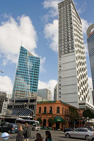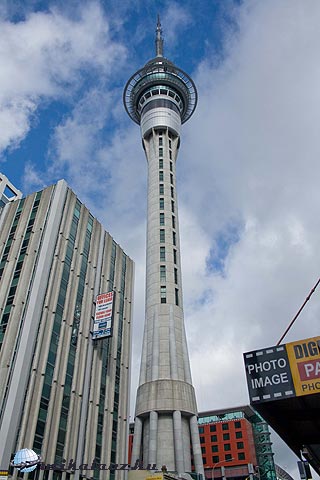 Lévén szállodánk mintegy 5 perc gyaloglásra volt a “Sky City”-től városnéző túránk itt kezdtük. Itt van a sokat reklámozott 328 m magas Sky Tower – jobbról -, van itt kaszinó, forgó vendéglő és a 192 m magasan levő korlát nélküli üvegaljú teraszról 360 fokos kilátás nyílik a környékre. Vagy ha a merészebbek éppen úgy kívánják mintegy 200 NZD-ért kiugrálhatnak (bunji jumping). Persze itt nem volt hosszú sor, de azért láttunk egy-két bátrabbat, aki kisétált. Én azonban jobban szeretem ha egy kicsit szilárdabb talajon járok.