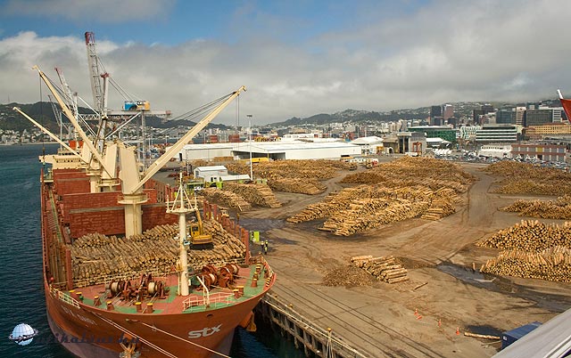 Wellington, a kikötő tele farönkökkel, Kína, Japán és Korea az útirány. Főleg építkezéshez.