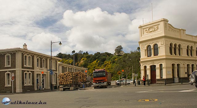 Ma reggel valóban egy kicsit hűvös van, a hőmérő 9 fokot mutat. Úgy határoztunk nem megyünk be Dunedinbe, hanem csak a helybeli kikötőben, Port Chalmers, sétálunk. A kilátó dombra igyekszünk, s mire felérünk már nincs hideg. Csendes, kikötő, illetve halászváros, itt is a fa a fő export, tele van a kikötő és állandóan hozzák az utánpótlást.