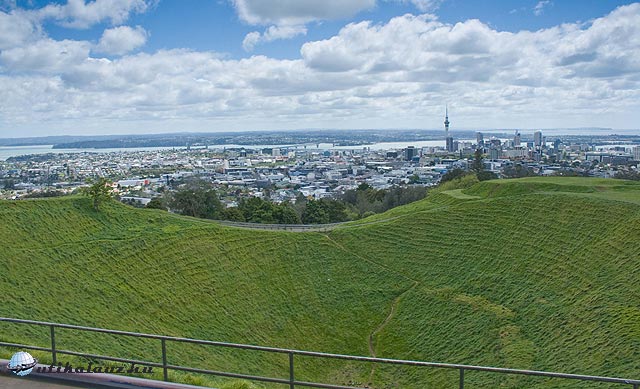 A múzeumnál egy másik járatra ülünk, irány Mt. Eden, Auckland legmagasabb pontja 196 m magas. Valamikor működő vulkán volt, reméljük nem gondolja meg magát, míg itt vagyunk. Kitűnő 360 fokos kilátás a Manukau-kikötőtől a Hauraki-öbölig. Nézelődünk, kék ég, egy-egy felhő, kívánni sem lehet jobb időt, szebb kilátást.