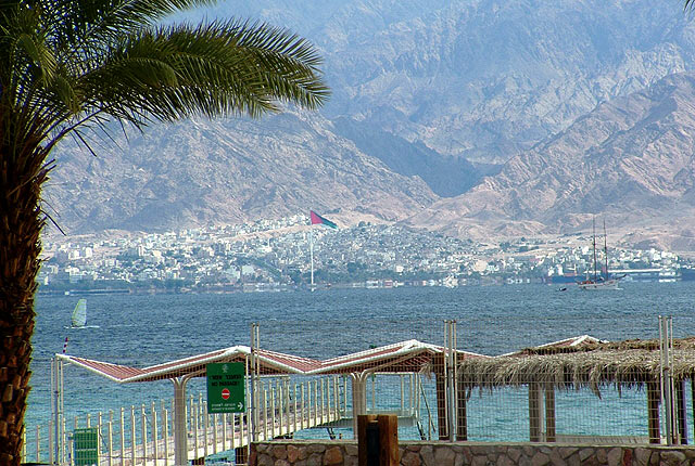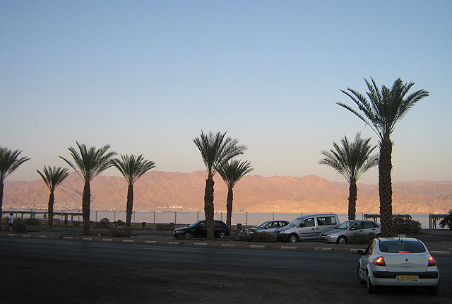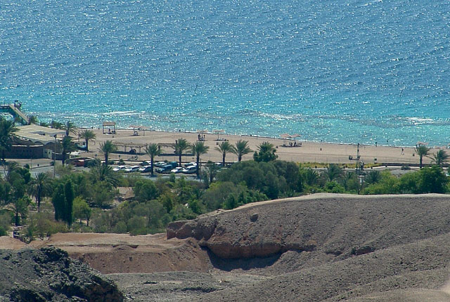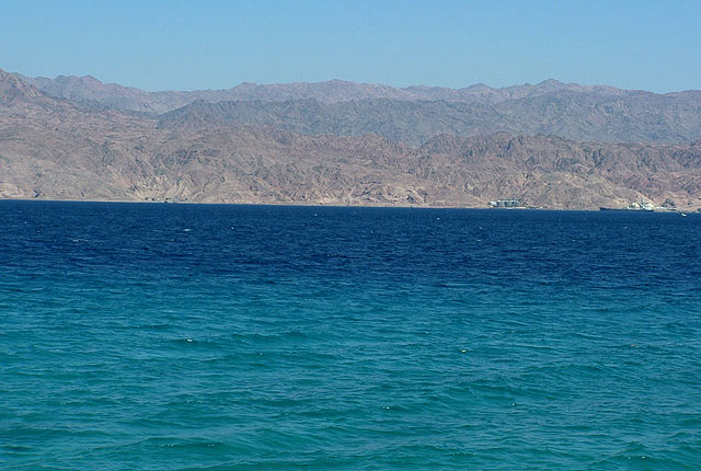 A parton való pihenés alatt figyeltem a tenger színeit. Az 5-6 színű kékség megbűvöli a nézgelődőt. A legsötétebb kéknél kb 7OO méter a mélység. A terület az ázsiai és afrikai törésvonalon helyezkedik el. Szemben Jordánia, majd Szaud-Arábia sziluettje látható.