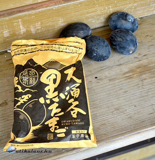 Onnan meg aztán drótkötélvasúton fel az Owakudani hegytetőre (kb. olyan magas, mint a Kékes, kb. 1000 m. tszf.). Itt mar kéngázt lehelt a hegy, es a kénes, forró, a földből előbugyogó vízben, kosarakban főzték es árulták a kemény tojást. Főzés közben megfeketedett a héja – mi is vettünk és ettünk belőle.