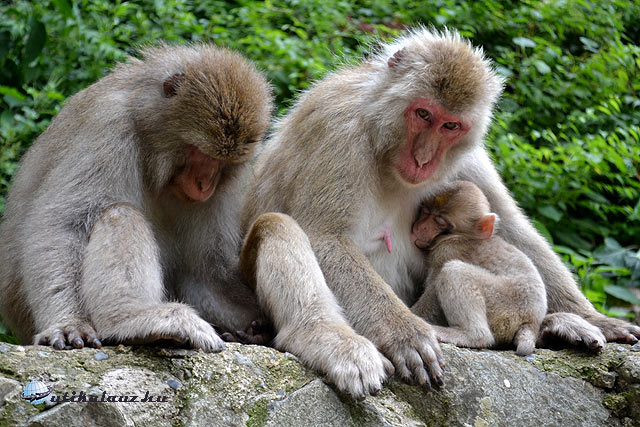Yumoto san, a házigazda elvitt minket kocsival (jó tágas, mégis kívülről nézve kicsi, mert szögletes) egyterű Hondájával a szomszéd falu, Shibu Onsen fölé. Onnan 20 perc volt még a völgy, ahol nappal a majmok tanyáznak (Jigokudani), részben róluk híres ez a hely itt. Lejönnek ugyanis a meleg forrás-, meg patakvízhez, de alapjában véve vadon élnek. Egy család tagjai mind, mintegy 160 egyed, japán makákók. A legaranyosabbak persze a kicsik, akik az anyjukon csüngenek. Sokszor apa, anya, gyerek együtt üldögélnek. Vakaródznak, kurkásszák egymást. Az öreg törzsfőnök majom meg ül, es vigyáz a rendre. Ha közel mész, rád vicsorog.