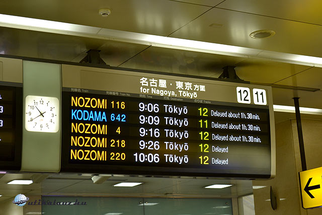 Az állomáson kandzsi (ez a kínaiból átvett japán) írásjelekkel feliratok a kijelzőn (nem tudjuk kibogarászni), a peronzárnál a vasutasok idegesek. Pirosan villog a vonaltérképen a Kiotó-Osaka szakasz. Bejutunk a shinkansen terminálra (külön állomás az állomáson belül: olyan, mint egy repülőtér), a táblákon nincs kiírva új érkezés, indulás. Sok várakozó, semmi angol nyelvű információ, csak a késésben lévő vonatok vannak kiírva. Telik az idő, előbb semmi hivatalos becslés, aztán lassan Tokió felé, majd nekünk lefelé, Osaka felé is megindul a forgalom. 1 óra 50 perces késéssel (!) vonatra kerülünk mi is. Jegyünk csak a “lassú” expresszekre jó, így a Nozomi vonatokra (amelyek kevés helyen állnak meg) nem, csak az úgynevezett Hikari és Kodama nevűekre, így hiába jönne hamarabb egy nekünk jó irányba menő vonat, csak plusz díjért szállhatnánk fel rájuk. Na, ezt nem kérjük. Igy is többe kerül 3 heti vonatozás, mint a repülőjegy ide Európából.
