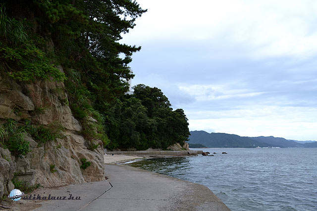 A három lefelé vivő ösvény közül a legkönnyebbet választva (végig kiépített, de elég meredek volt, bár a bátrak felfelé is mentek) leereszkedtünk a faluba és pár könnyű üdítő bekapása után elbuszoztunk a strandra – mert itt kérem nem fürdenek csak úgy össze-vissza akárhol a tengerparton! – ami egy kijelölt partszakasz, a vízben bójákkal elkerített résszel. Remek volt lemosni az út porát, de a zuhanyzó, öltöző irgalmatlan mocskos volt és a kabinos kiscsaj ötkor (na jó, negyed hatkor) zárta, úgyhogy épp, hogy befértünk. Utolsó busszal vissza a kompkikötőbe, komp és vonat vissza Hiroshimá-ba.