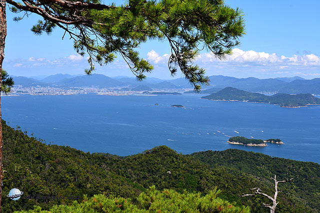 A hegyre előbb kisbusz, utána kis-, majd nagykabinos felvonó vitt – 430 m csak a szintkülönbség, kb. olyan magas, mint a Normafa, de a tengerszinttől nézve közvetlenül, az már így rögtön több. Ahogy kiszálltunk odafent, pazar kilátás tárult elénk a beltengerre (így hívják a Honshu és Shikoku főszigetek közt elterülő szigetvilágot). Fénykép nem is tudja visszaadni a látványt. Képzeld el a Jón-tengeren Ithaká-t, vagy a dalmát szigeteket, csakhogy a háttérben nem Split, vagy Ragusa fekszik, hanem egy lapályos folyódeltában Hiroshima. A partvidék persze elég kiépült, a szigetek közt halászvarsák fakereten, meg tán halszaporító telepek. De a szigetek maguk nagyon zöldek.