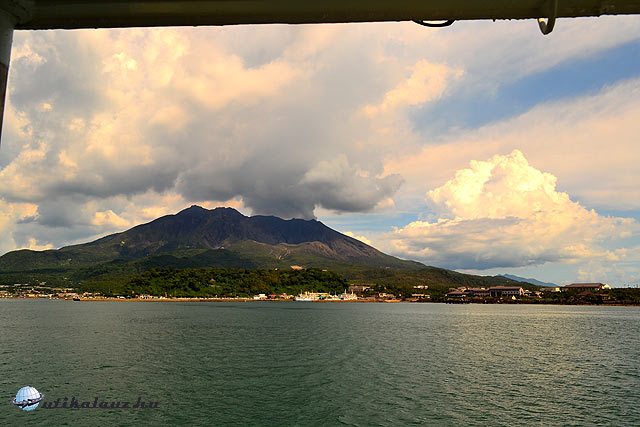 Még lementünk a kikötőbe, halványan kivehető volt az alig tengerszorosnyira levő Sakurajima vulkán. Meg persze az utcán, a járdaszegély mellett felgyülemlő sötétszürke hamuról, ami itt az égből hullik gyakorta. Merthogy a vulkán aktív.