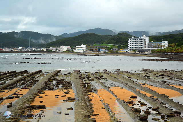 Követtük a strandtáskás lányokat es végül pont a jó helyre érkeztünk: egy – utóbb az útikönyvben is meglelt – Aoshimanevű üdülőhelyre. Bár sajnos esősre fordult az idő, fürödtünk (azaz inkább lubickoltunk egyet az igen meleg óceánban – a Kuro-shio olyan itt, mind Európának a Golf-áramlat. Nagy, tarajos hullámok voltak, meg csíptek a medúzák.