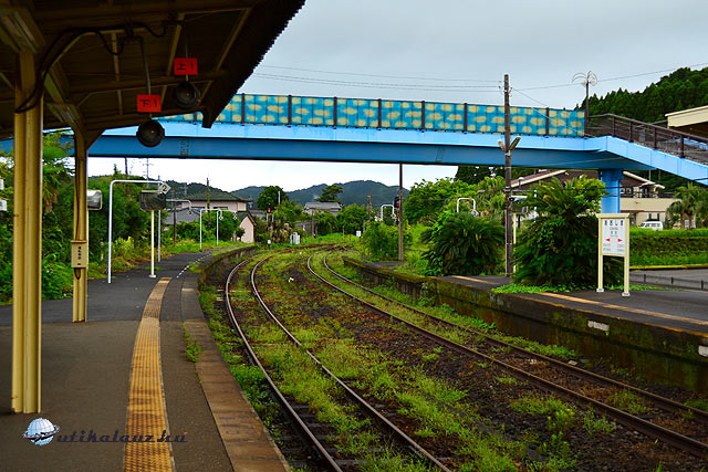 Reggel “fejből” tájékozódtam az állomáson, kapkodtam es rossz felé menő vonatra szálltunk. Kirándultunk volna dél felé az egyik kis vulkánhoz, ehelyett keletre mentünk, egy Miyazaki nevű városba (azaz a környékére), a Csendes-óceán partjára. Kis feszültséget okozott először, merthogy útikönyv se volt nálunk, aztán a mobilomon lévő, adatkapcsolat nélkül is elérhető térképen kinéztem egy helyet, ahová a végállomáson még átszállva el kéne jutni: tengerpart, öböl, félsziget, hátha akad strand is. Kis „kockakerekű”, vagy 40 éves dízel vicinálisra szálltunk (a kitett menetrendben csak a kandzsi írásjeleket tudtuk böngészni).