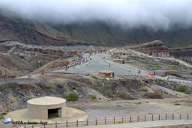 A nagy öreg kráterben előbb tó képződött állítólag, aztán a víz átszakította a peremet, lefolyt es kisebb fiók-vulkánok (az egyik nagyon helyeske, alig 100 m magas lehet es teljesen fű borítja, zöld, “felfordított rizses tál” a neve), meg nagyobbak is képződtek, köztük pedig kialakult egy felső fennsík is, úgy tszf. 1300 m-en. Busz visz fel ide és aztán tovább az egyik fiatal vulkán, a Nakadake (1592 m) egyik aktív kráteréhez, amely a kagoshimai Sakurajimá-éhoz képest most éppen nyugodtabb állapotban leledzik: lent a kráter alján kénsavas, zöld vizű tó gőzölög csupán (úgy emlékszem: mint a Vezúvon Olaszországban) és pöfékeli a kénhidrogént. Az utolsó 800 méternyi utat kötélvasúttal tettük meg felfelé, de az autósok egészen idáig is feljöhetnek. A kráter peremén nagyon korrekt jelzőrendszer figyelmeztet, ha veszélyessé válik a szél iránya miatt a levegő gáztartalma. Mindenfelé betonbunkerek, mert elvileg hirtelen köveket is kezdhet hajigálni a hegy, meg egy kén- és habkő árus, kiírva: „messziről jött utazó, ne vegyél tőlem ként, mert nem engedik fel a repülőre”.