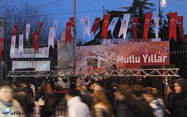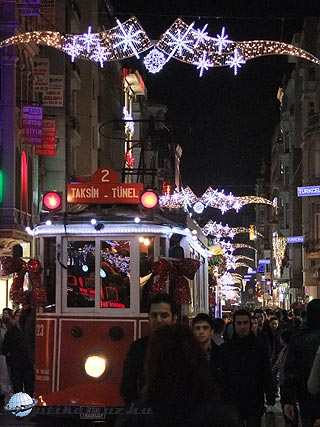 , ahonnan indul Isztambul legnyüzsgőbb utcája az Istiklal Cadessi. Ez sétáló utca, közepén villamos sínnel, amin egy nosztalgia villamos jár. Most karácsonyi díszbe öltöztetve közlekedett. Ez az út vezet el a Híres Galatasaray gimnázium kapuja előtt. A Galatasaray Lisesi Törökország legrégebbi középiskolája, melyet 1481-ben alapítottak. A francia, kéttannyelvű iskola tanulói alapították 1905-ben a futballcsapatáról híres Galatasaray sportklubot.