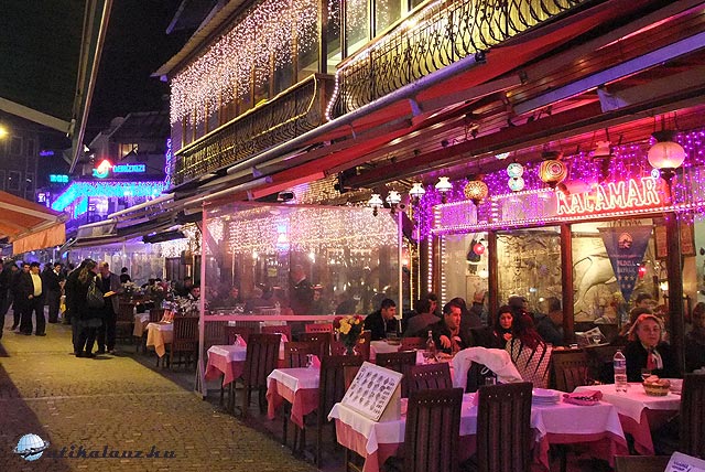 Kebab, vagy Köfte (török fasírt) árusító éttermek szinte mindenfelé találhatóak, legtöbb helyen hatalmas párnák, puha karosszékek között ehetünk. Ilyenkor télen is működtetik a teraszt, vagy gáz, vagy infra melegítővel felszerelve. Mondjuk szerintem 10 fokban ez minden melegítő mellett is hideg, de szabad a választás.