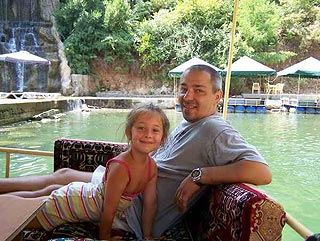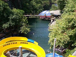 Voltunk egy nagyon szép kiránduláson a Dimcsaj-folyó partján. Igazság szerint ez csak egy nagyon kicsi folyócska amely egy nagyon szép hegyi szurdokban folydogál, és Alanya szélén folyik bele a tengerbe. A képeken látható éttermek a folyó közepén állnak, a vendégek így evés közben a vízbe lógathatják lábukat vagy hordókra szerelt úszó alkalmatosságokon fogyaszthatják finom ebédjüket.