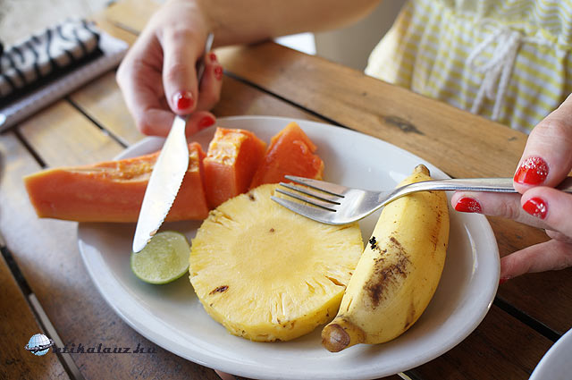 Vacsoránkat a szálláson fogyasztottuk el. Beszédbe elegyedtünk a pincérrel, akitől megtudtuk, hogy hallottak már Magyarországról. Tudják, hogy a náluk különlegesnek számító Nokia telefont nálunk gyártják és nem Kínában. Annak ellenére, hogy a napot henyéléssel töltöttük még desszertet is rendeltünk. Isteni sült banánt, illetve sült ananászt ettünk csoki fagyival. A személyzet nem győzött bocsánatot kérni, amiért nem vanília fagyival szolgálták fel a gyümölcsöt, így a harmadik napon már biztosan jelenthettük ki, hogy a világ legfigyelmesebb vendéglátóival van dolgunk.