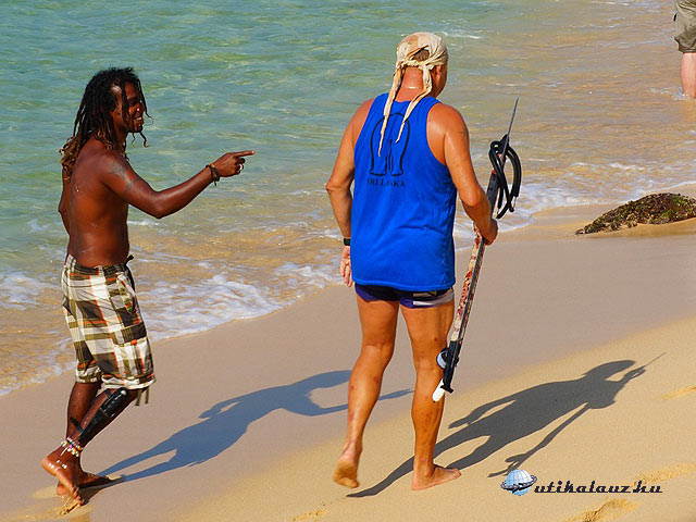 Reggelinél, a szomszéd asztalnál egy orosz család ült. Az gyorsan világossá vált számunkra, hogy igen más kultúrából érkeztek és az érdeklődési körük is nagyban különbözik a miénktől. Kapkodva fogyasztották el az utolsó falatokat, majd rohantak le a partra, ahol már várta őket egy halászhajónyi szigonypuskás helyi alak. Kaptak egy gyors tréninget a puska használatáról, majd eltűntek a tenger habjai között.