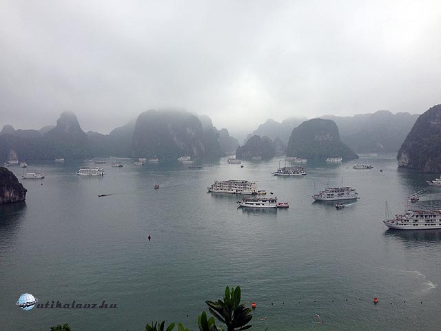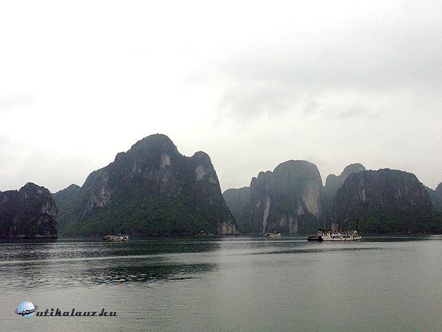 A következő reggelen az utazási iroda busza pontos időben felvett a szállodánk elől (tilos megállni a központban, ezért araszolva halad a busz és fel kell rá pattanni). Csomagjainkat a szállodában kijelentkezés után felár nélkül megőrizték. 3 órás eléggé rázós út következett a Ha Long öböl kikötőjéig (175 km), ahol átszállítottak egy csónakra, amivel elvittek a hajónkig. Délre értünk a fedélzetre, rövid pihenő után ebédet szolgáltak fel, majd hajókáztunk a lélegzet-elállító öbölben. Az öbölben kb. 3000 kisebb-nagyobb mészkő-sziklatömb emelkedik ki a vízből, csodálatos látványt nyújtva a köztük hajózóknak. Egyetlen szépséghibája, hogy a rengeteg hajó következtében eléggé koszos a víz, papírok és palackok úszkálnak elég nagy mennyiségben, a levegő pedig eléggé szmogos a kikötő környékén. A hajó eleinte ütött-kopottnak tűnt, de mint megtudtuk, 10 éve épült – idegenvezetőnk elmondása szerint egy hajó sem bír 15 évnél többet ezeken a vizeken. A kabinok kényelmesek voltak, saját fürdőszobával és óriási ablakkal, a legfelső szinten pedig napozóágyakon lehetett pihenni.