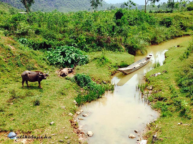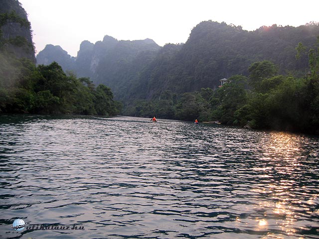 Kb. 12 személyes csónakkal utaztunk a folyón megközelítőleg fél órán át. Útközben láthattunk anyukákat csónakban ülve és a gyermekét várva, aki lemerülve a víz alá algákat gyűjtött és dobta nagy halomba a csónakba, vízi bivalyokat dagonyázni a folyóban és festői tájat mészkősziklákkal.
