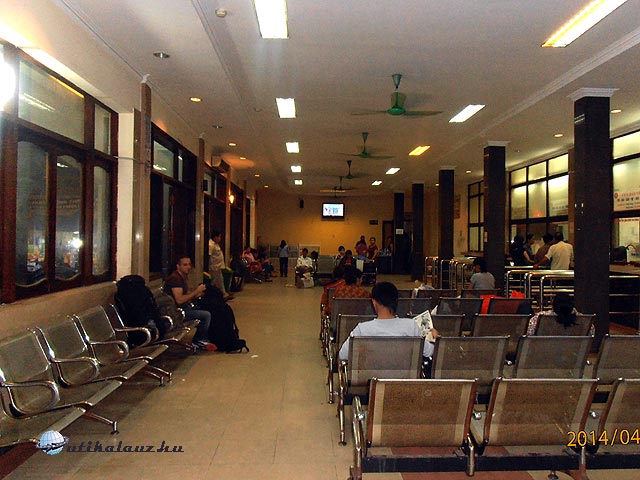 A vonatállomás egy nem túl jellemző, utcai árusokkal övezett épület. Az állomás melletti ATM kijelzőjén furcsa ikonok szaladgáltak, oda nem mertük betenni a bankkártyánkat (később egy helyi árus is igazolta, hogy az bizony nem működik, ám másikat nem tudott mondani). Első utunk egy valutaváltó felé lett volna, 15 kilós hátizsákkal vánszorogtunk a környező utcákban a piaci forgatagban. Bejártuk a környéket, ám valutaváltónak híre sem volt. Találtunk egy bankot, ami zárva volt, majd felvilágosítottak, hogy szombat révén valamennyi bank zárva tart. Így a bankfiók ATM-jéből kényszerültünk pénzt felvenni, ami egyszerre csak 2 millió VDN-t ad ki (mint kiderült, minden pénzfelvételkor 55000 VDN összeget is levon költség címén). Helyi pénzzel felszerelkezve visszamentünk az állomásra megvenni a jegyeket. A 21 órás vonatra minden jegy elkelt már, csak a 23 órakor indulóra tudtak egy alsó és egy felső ágyat adni (420 000 VDN alsó, 395000 VDN a felső ágyra a jegy). A visszafelé tartó vonatok állítólag már mind tele voltak, így csak egy turistáknak szánt vonatra adtak jegyet 750 000 VDN/ db áron (a neten talált információknak megfelelően, a 2. számú ablaknál beszéltek angolul). Az éjszakai vonatokon két féle ágy és szék között választhatunk: kemény ágy /szék, ami olcsóbb vagy puha ágy/szék- ezt szokták előszeretettel ajánlani és mellesleg drágább is. Mindkettőt próbáltuk, nagy különbséget nem vettünk észre az alvás minőségében.