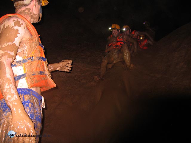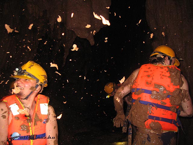 Annak ellenére, hogy a recepciós szerint újra be kellett volna fizetnünk a belépőt, a bejáratnál nem kérték, amikor mondtuk, hogy csak a Dark cave-t szeretnénk látni. Ezennel az üres szabadtéri váróterem nem riasztott meg, türelmesen kivártuk, míg valaki megjelenik. Kettőnknek eléggé borsos árat mondtak, de szerencsére még megjelent egy hat tagú társaság, akik csatlakoztak. Már fél órája várakoztunk az indulásra és valamennyien toporogtunk, mondván, hogy sietnünk kell, 17 órakor indul a buszunk. Ekkor derült ki, hogy mindannyian ugyanazzal a busszal készülünk távozni, így a továbbiakban már nem izgattuk magunkat, hisz úgysem indul el üresen a busz, ha elkésünk sem lesz akkora baj. Fürdőruhára vetkőzve egy mentőmellényt és egy lámpával ellátott sisakot kellett felvennünk, a ruháinkat pedig az erre a célra szolgáló szekrénykékbe zártuk. Révén, hogy a hátizsákjainkat a közös csomagmegőrzőben hagytuk a hostelben, és már nem használhattuk a szobákban lévő szekrényeket, az összes pénzünk nálunk volt, amit nem szerettünk volna az itteni szekrényekben sem hagyni. Így egy zacskóba gyűrve a mellény alatt cipeltük magunkkal a vízálló fényképezőgép és kamera társaságában. Kajakkal közelítettük meg a barlang bejáratát, majd kb. 100 méter gyaloglás után kezdődtek az izgalmas részek. Eleinte csak térdig majd combig sétáltunk az iszapos vízben, a sisakon lévő lámpa szolgáltatta az összes fényt, majd egyre szűkebb járatokba értünk, néhol négykézláb közlekedve, derékig érő sziklákon átmászva. Az iszap egyre csak sűrűsödött, végül mindenünk csupa iszap lett. Ennek betetőzéseképp a barlang végén (illetve ahonnan már nem vittek tovább) egy nagyobb helyiségbe értünk, ahol megkezdődött az őrült iszapgolyózás és iszapon csúszdázás egy szikláról. Az idegenvezető is kapott jócskán, végül senkin sem volt már tiszta felület. Kifelé menet egy, a barlangban lévő tóban lemostuk magunkról az iszapot, és visszakajakoztunk a kiindulási ponthoz. Az egész túra kb. 2 órás volt, jócskán kellett sietnünk, hogy elérjük a buszt. Az ára kettőnknek 480 000 VDN volt, ha jól emlékszem.