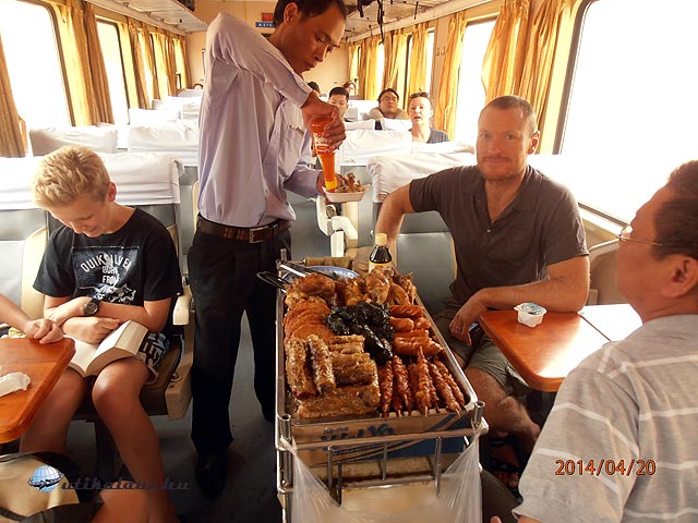 A thai éjszakai vonatos tapasztalat alapján, ahol négyszeres ára volt a sörnek, bevásároltunk a helyi árusoktól, de alaptalannak bizonyult a gyanúnk, a vonaton teljesen hétköznapi árakon kínáltak enni-innivalót.