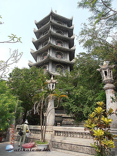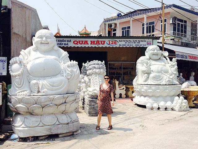 Harmadnap reggel előállt az előre megbeszélt autó sofőrrel, hogy elvigyen minket Huéba. Nagyon örültünk, hogy itt már nem egyénileg terveztünk helyi buszjáratos megoldást, mert nagy valószínűséggel nem bírtuk volna ki, annyira meleg volt. Útközben megnéztük a Márvány-hegységet, ami egy öt, az alapelemekről (víz, fa, föld, fém, tűz) elnevezett mészkő- és márvány-hegyből álló nevezetesség. Egy óra alatt körbesétáltuk a fő látnivalókat a Víz hegyen. Itt található a legszebb buddhista barlangtemplom, valamint márványból faragott szobrokban gyönyörködhetünk kicsitől az gigantikus méretig. Kényelmes sétával több, mint 1 óra szükséges, inkább másfél-2 az összes látnivaló megtekintéséhez.