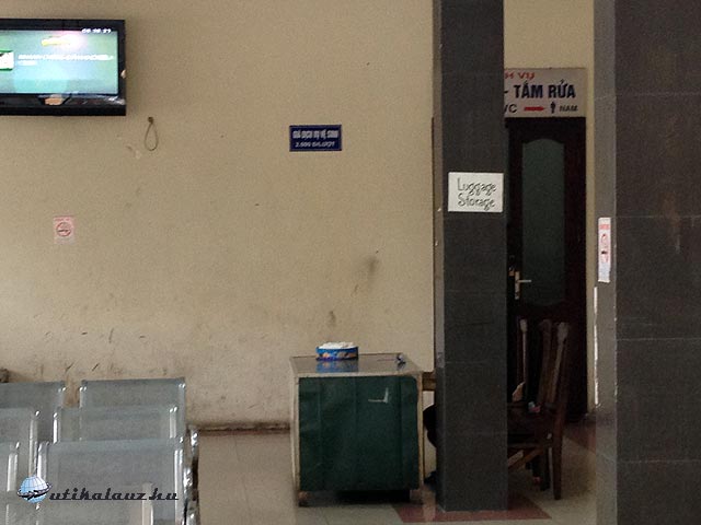 Az állomás épületében egy A4 lapon „csomagmegőrző” feliratot találtunk, ám azt az épületet körbejárva sem találtuk meg. Végül kiderült, hogy a lap mögötti közWC-ben van a csomagmegőrző, ahol szívélyesen fogadtak és felajánlották, hogy 150.000 VDN/ 3 nap/ 2 csomag áron megőrzik a hátizsákjainkat (ellentétben az interneten említett 3 USD/ 12 óra árral). Mivel gyanúsan olcsó volt az ajánlott ár, szerettük volna megnézni, hol hagyjuk a csomagokat, mire a hölgy szívélyesen bekísért, kinyitotta a tusoló félig lerohadt ajtaját és rámutatott a vízben tocsogó padlóra. Ezzel világossá vált, hogy a hátizsákokkal együtt utazunk tovább. Mivel még rengeteg időnk volt a vonat indulásáig, átmentünk az állomással szemközt található kávézóba, ahol elkövettük azt a hibát, hogy a helyi mosdót használtuk. A bárpult melletti ajtón bemenve egy sötét sikátorba jutottam, ahol balról letámadott egy kutya (szerencsére láncon), jobbról a helyiek lakásába nyitottam be, ahol másik 4 kutya támadott rám; ezt az ajtót is becsapva benyitottam a fészerbe, majd utolsóként megtaláltam a rozsdás szegekkel tarkított WC ajtót, ahol döngtek a legyek, bogarak, és egy rendkívül mocskos guggolós WC állt rendelkezésre. Fizetéskor fokozott figyelemmel néztük a visszaadott pénzt, mivel az utazók 90%-a átverésekről számol be egész Vietnámban. A kávézós be is próbálkozott, 110 ezres számlánál 500 ezerből 90 ezret adott vissza, de mosolyogva korrigálta, miután felhívtuk figyelmét a tévedésére. Úgy tett, mintha a százezres bankjegyekért külön kellett volna elmennie a pultig, amit- természetesen- szándékában állt megtenni, csak mi voltunk túl gyorsak (átlag árak: üdítő: 15.000; 1,5 literes víz 20.000VDN; sör 30.000 VDN utcai árusoktól; kávé 30.000 VDN, üdítő 25.000 VDN bárban). A vietnámi kávé forró víz átcsepegtetésével készül az őrölt kávén és csokoládé íze van (Vietnám állítólag a második legnagyobb kávéexportőr, egy helyi viccesen mondta, nem tudja, mi mit iszunk otthon, ha nincs ilyen csokoládé íze).