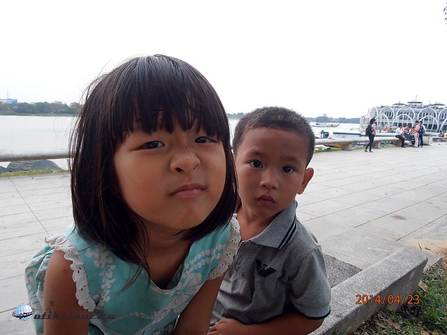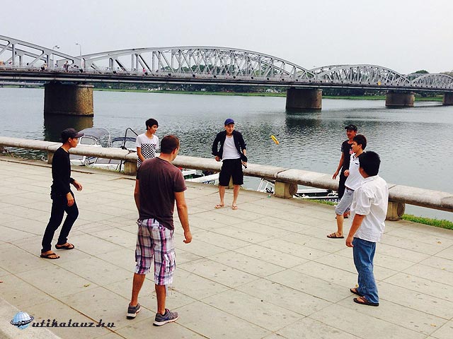 Délutáni utolsó célpontjaink a Thien Mu pagoda és egy rizsmúzeum volt. A hétszintes pagoda egy dombon terül el, gyönyörű kilátással a folyóra. Itt elfüstöltünk egy előzőleg készített és vásárolt füstölőt Buddha tiszteletére. A rizsmúzeumban egy idős hölgy bemutatta mi mindent készítenek bambuszból, hogyan éltek vidéken és hogyan őrölték régen a rizst. Látogatásunk végeztével a sofőrünk letett egy helyi étteremnél, ahol degeszre ettük magunkat finomabbnál finomabb falatokkal. Szabad programként kisétáltunk a folyópartra nézelődni, pár perc padon való üldögélés után egy fiatalokból álló társaság csapódott hozzánk, megkínáltak sörrel, csípős poros mangóval, mi cserébe a helyi whiskey-vel kínáltuk őket, végül a párom majd egy órán át beállt közéjük és egy tollas fura labdával lábteniszeztek. Ez idő alatt három egyetemista is odajött, és hosszasan beszélgettünk, mint kiderült, minden este turistákat keresnek a folyóparton, akikkel az angoltudásukat gyakorolják.