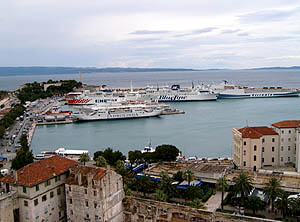 4. nap – Lehűlt a levegő, éjszaka esett, megijedtünk a rossz időtől. Úgy döntöttünk, reggeli után bemegyünk Splitbe. A rossz idő felhőket, kicsit erősebb szelet, de 28 fokot jelentett. Rájöttünk, hogy nem a Balatonon vagyunk. Ez az idő is megfelelt nekünk. Splitben óriási forgalom fogadott minket, de sikerült 5 kunás parkolót találni, nem messze a kikötőtől. Megnéztük Diocletianus palotáját, mauzóle-umából kialakított templomot, felmásztunk a toronyba (óriási szél fújt fenn), sétáltunk egy nagyot a városban, és megcsodáltuk a számunkra igen érdekes kikötőt, a nagy kompokkal, luxus hajókkal. Hazafelé óriási dugó, 2 óra alatt tettük meg a 22 km-t. Reggel házigazdánk nem tartotta jó ötletnek kirándulásunkat. Most már értettük miért. Augusztus 5. ünnepnap, péntekre esett, a horvátok elindultak a hosszú hétvégére a tengerpartra. A strandolást elnapoltuk…