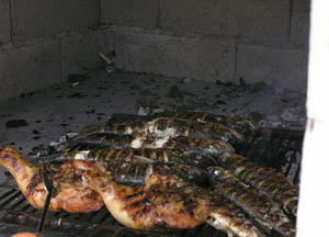 Kirándulás után, strand, este pedig grill party háziasszonyunk segítségével. Ő sütötte meg nekünk a reggel vásárolt tengeri halat és az otthonról hozott husikákat. Az érkezéskor keletkezett hűvös légkör, itt oldódott fel. Nézzétek mit sütött nekünk! Nagyon finom volt. Kiderült, hogy Németországban szakácsnőként ment nyugdíjba.