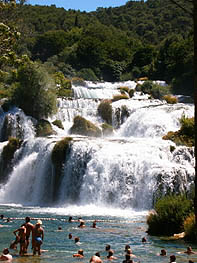 A vízesés egy csoda! A vízesés mellett működő eszközökkel bemutatják, mire lehet használni a víz erejét. Körbesétáltuk, délután 3 órakor értünk vissza a strandra. Fürödtünk egyet – a víz “hűvös” – irány vissza a kikötőbe. Lefelé már nem volt túl rózsás a helyzet, egy órát várunk, hogy feljussunk a hajóra. A parkolásért legomboltak rólunk újabb 45 kunát kocsinként. Hazafelé betévedtünk Sibenikbe, újabb dugó. Trogir-Seget halászfaluban vártak a többiek. Itt beszéltük meg a halvacsorát. Este nyolckor ültünk be az étterembe, ha hiszitek, ha nem fáztunk! Tengeri herkentyűket ettünk, szerintem nem drágán. Fekete kagyló 30, rántott tintahal 35, 3 féle tengeri halból készült tál 45 kuna.