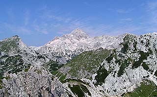 A csúcson marha meleg volt, és túristákra specializálódott kis legyek szálltak ránk, illetve akkor kezdett el S. nagyon leégni, mivel naptejet elfelejtettünk vinni. Fényképezkedtünk, és megszemléltük a Triglavot. Kétoldalt lehetett látni a két kis házat (dom, ill. koca), ahonnan a túristák reggel indulnak a csúcsra. Még hófoltok is voltak a völgyekben.