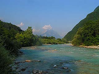Az út első fele a Soca (Isonzo, nekem ez is új információ) völgyében vezetett, ami vízitúrák kedvelt színhelye. Sajna, mire mi odaértünk, késő délután volt, és a túrázók már húzgálták ki a kenukat a partra, de a folyó így is gyönyörű, zöld, habzó, stb. volt.