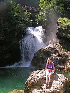 Először a Savicához mentünk, ami a szlovén nemzeti érzés egyik szimbóluma (a másik a Triglav), van is France Preseren híres 19. sz-i szlovén költőnek egy Keresztelő a Savicánál c. elbeszélő költeménye, brrr! Ebből kifolyólag a vízesést nem lehet megközelíteni, csak messziről szemlélni egy kilátóból. Emiatt majd megütött a guta, miután 500 lépcsőt gyalogoltam felfelé egy hegyoldalon, izzadt anyukák hónalját szagoljam egy kisebb szobányi alapterületű dobozban tülekedve (ez volt a kilátó). Pufogva vissza is fordulunk rövidesen. Egyébként már az gyanús volt nekem, hogy odaúton a szembejövők arcáról se azt a feledhetetlen élmény olvastam le, amit az útikönyv ígért, mondhatni fapofával kutyagoltak lefelé. És még a parkolás is drága volt!