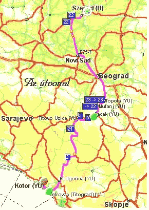 Úgy döntök megpróbálom és ezzel minden előzetes útvonal tervet rombadöntöttem – még szerencse, hogy az utazási iroda mellékelt a úti információs csomaghoz egy ajánlott útvo-nalat tartalmazó térkép másolatot. Vidáman poroszkálunk 100-al – nem akartam többet a 20 éves 1200-es Ladámtól – a három sávos új úton – a középső sáv csak előzésre használatos és többnyire be is tartják – sehol egy lakott település csak leágazások erre meg arra, írdd és mondd egy teljesen szűz földre épített új út.!! Egyszer csak kapu és kérnek 25 DM-et, hajtás tovább, már túl vagyunk NoviSadon, félóra után újabb kapu, levesznek 10 DM-el, de a fene bánja hiszen a távolban már Beograd látszik. A kapott kalauz és térkép alapján majd-nem csontnélküli átkelés Beogradon, – az utolsó jobbra-balra kombináció elvétése után kis külvárosi zötykölődés és némi érdeklődés és szívélyes útbaigazítás után már a helyes irány-ba gurulunk 80-90-es tempóval egészen Ljig helységig, ahol cammogóra fogtuk a tempót, mert olyan felhőszakadás zúdult ránk, hogy a maximális sebesség a 30 volt.