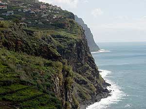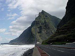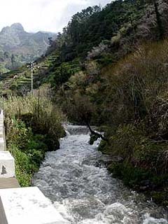 Itt észak felé fordultunk, és elindultunk a sziget belsejébe. Aki látta a Gyűrűk ura c. fim első részét, és emlékszik Tündeföldre, az könnyen el tudja képzelni, hogy a sziget belseje milyen, mert szerintem aki kitalálta, hogy Tündeföld milyen, biztos, hogy járt Madeirán. Magas, fenyővel fedett, illetve feljebb kopár hegyek között vezetett út, és bármerre néztünk vízesések csordogáltak vagy zúdultak ki a sziklák közül. A fényképezőgép keresőjében egyszerre minimum 6 zuhatagot lehetett lefotózni. Mellettünk pedig kis folyó rohant az óceánba, megálltunk és egy pillanatra úgy éreztük, mintha akkor éppen Ausztriában lettünk volna.