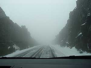 A dzsungel aztán szép lassan fogyott, és ahogy egyre feljebb érünk végül csak zuzmó marad. Itt kb. 1700 m. fölött voltunk, úgyhogy a következő látnivalókat a sziget felett áthaladó felhők adták, melyekbe “belementünk”. A a hágók között külön élmény volt látni a sziklák között átsuhanó felhőket látni-hallani a tomboló szelet. Szinte észre sem vettük, és megváltoztak az útviszonyok, vízes, majd hókásás lett az út. Lápos vidékhez értünk, ahol hófoltok tűntek fel, majd egybefüggő 30 cm-s hótakaró vett minket körül, és minimális lett a látótávolság, a szél pedig igen erőssé vált. Az úton csak egy nyompár volt már járható. Vissza út nem volt, így nyári gumival keltünk át a hágón.