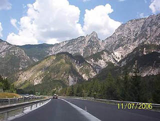 Magyarországon a reggeli csúcs ellenére sem volt nagy forgalom, Csornán kávéztunk egyet, majd Szombathely után Bucsunál léptünk át osztrák földre. Innen autósztrádán – matrica 7,6 Eur – utaztunk. Hihetetlennek tűnt, hogy alig van forgalom. Gráz után nagyon szép az Alpok, a hegyoldalakon szétszórva tanyák, virágos házak, legelésző állatok. Klagenfurt előtt kicsit sűrűsödött a forgalom, de még itt sem nagy. Feltűnt, hogy rengeteg dán kocsival találkozunk. A Wörther-See partján egy panorámás pihenőben megálltunk néhány percre megcsodálni a tavat, majd nemsokára a Dreilenderecke nevű pihenőben újra, márcsak szokásból is, itt mindig megállunk. Megtankoltunk, mert a benzin Ausztriában olcsóbb, mint Olaszországban. Máskor itt zsúfolásig telt parkolóban keresgéltünk helyet, most azt tapasztaltuk, itt sincsenek sokan.