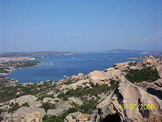 A kényelmes és csodálatos hajóút után fél ötkor kötöttünk ki Szardínia szigetén, még egy fél órát kellett várni mire sorra kerültünk a partraszállásnál. Minden nagyon rendezetten és gyorsan ment. A hatalmas kikötőben irányították a forgalmat s pillanatok alatt Olbiában találtuk magunkat. Innen a Costa Smeralda magyarul Smaragd-part felé vettük az irányt, ez a sziget legszebb, egyben legdrágább partja is. Kanyargós utakon haladunk, mellettünk a tenger tagolt öbleivel. Hasonló, mint Horvátországban. Motorcsónakok hasítanak fehér habokat a mélykék vízbe, mindenütt kis strandok. Az útmentén virág, leánderek. Pihenőkben meg-megállunk bámészkodni, helyi specialitásokat, sajtokat árulnak.