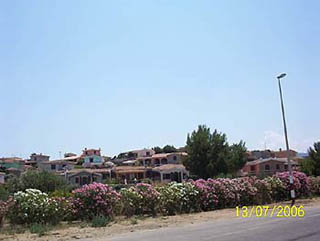 Később eltűnnek a hegyek, narancsfaligeteket, gyümölcsösöket, szőlőskerteket látunk. Az út szélén egy egész jó állapotban levő nuraghet csodálunk meg, majd a kempinges bajor szomszédaink által ajánlott Santa Maria Navarese-ben megkeressük a Blu mare kempet. Először a városban bolyongunk, később vesszük észre a város előtti kempinget jelző táblát, ám azon is más név szerepel, de aztán rögtön rábukkanunk. Valóban igaza volt a hölgynek, nagyon jó hely, hatalmas fák alatt közvetlenül a parton van. A recepciós lányka itt is aranyos, kiválasztunk egy jó helyet és fürdünk. A Tyrrén- tenger haragoskék, és jókora hullámokat vet. Vize meleg, simogat és ringat. Jól elvagyunk késő estig itt. A lemenő nap fénye megvilágítja a hegyoldalban fekvő várost, lenyűgöző. A másik oldalon Arbataxot látjuk.