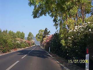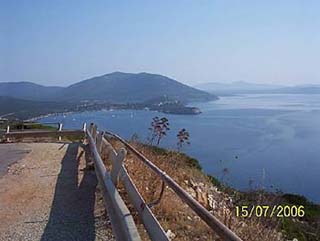 Utunk során ez a kemping az egyetlen hely, ahol bunkóval találkoztunk. Egy férfi és egy nő, úgy néz ki nem is itteniek, nem óhajtották növelni a kemping forgalmát. Nem is erőltettük, rögtön a délnyugati parton levő Tonnara kempingbe mentünk, ahol kizárólag kedves emberekkel találkoztunk. Az odavezető út keskeny, dombos, az egyik dombról szépen látni a várost és a kikötőt. Elszórva lakóházakat látni, legelőket, macchiát.