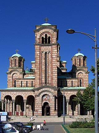, hogy megnézzük a Szent Száva templomot, de sajnos idő hiányában csak a Szent Márk templomig – jobbról – jutottunk. Ennek a szép templomnak a homlokzatán ugyanúgy megfigyelhető Szent Márk szimbóluma az oroszlán, mint a Velencei Bazilikán. A széles bevásárló utcán, jól megférnek együtt a régi és a modern épületek.