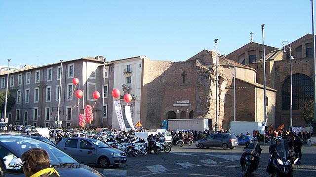 Miután elfogyasztottuk a reggelinket a Termiben lévő ChefExpress-ben ismét áthaladtunk a Köztársaság téren, ahol valamelyik párt aktivistái éppen gyülekeztek, rengeteg piros lufi, sok piros zászló volt náluk. Később több ponton is találkoztunk velük a városban. Benéztünk a téren lévő, különös falú Santa Maria degli Angeli templomba. A külseje azért ilyen, mert egy valamikori római fürdőt alakítottak át.