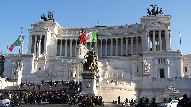 Pár lépés múlva ismét a Vittorio emlékműnél találtuk magunkat. Újból és újból lenyűgözött. Szerintem, méltatlanul nem kapja meg ez az emlékmű az elismerést a rómaiaktól. Ünnepélyesen és élesen emelkedik ki Róma panorámájából, nem lehet mellette csak úgy elmenni. Az egységes Olaszország első királyának, II. Vittorio Emanuele-nek való tisztelgés jeléül építették. 1895-ben Guiseppe Sacconi tervezte, és végül 40 év múlva készült el. Bottinióból származó fehér márványból készült. Az emlékmű közepén az 1915-18-as háborúban elesett ismeretlen katona sírja is megtalálható, az öröklánggal. A sír mellett állandóan két katona áll díszőrséget.