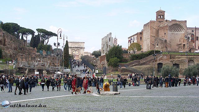A Colosseum mellett van közvetlen a Forum Romanum kijárata. A Forumra bemenni csak leírások és részletes térkép segítségével érdemes. Egyébként, semmitmondó romhalmaznak tűnik az egész, ha nem tudod a dolgokat mihez kötni. Az egész Forum történetében 3 korszak épül egymásra. A királyság alatt kezdte önálló életét. A mocsarat lecsapoltatta Tarquinius Priscus, Róma, félig görög 5. királya és oszlopos csarnokokat építetett. Akkor még csak üdülőhely, sétatér volt. A mérete mindössze 220 m x 35-50m volt.