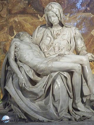 A templom belsejébe érve az első volt, aminek látványára közelről vágytam, az a Pieta. Mária térdén tartja a keresztről leemelt, halott Krisztust. A pieta olasz szó, részvétet, szánalmat és sajnálkozást jelent. Michelangelo szobrai többnyire mély, belső mondanivalót rejtenek. A művész jól ismerete az anatómiát, képes volt az emberi test izomfeszültségét vagy ernyedtségét is kőbe faragni. Művei által jócskán meghaladta a maga korát, egyedülálló teljesítményét napjainkig nem tudta senki túlszárnyalni.