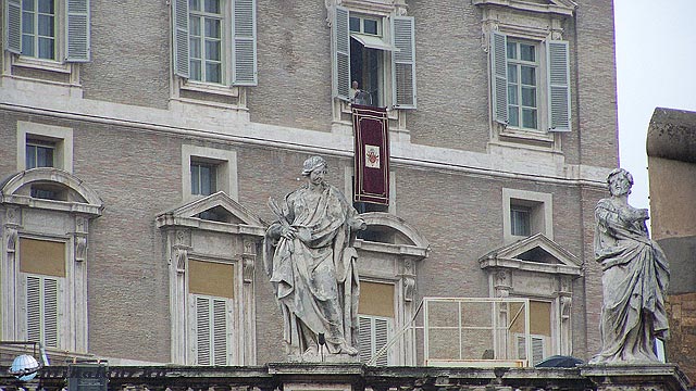 Amennyire az időnk engedte körbe jártuk a bazilikát és kimentünk a térre, ahol már egyre nagyobb tömeg várta a pápát, tele lett a tér sok színes esernyővel. Pontban, délben megjelent a pápa, áldást osztott 6-7 különböző ország nyelvén de magyarul nem. Végül megáldotta az országút lovasait, amit a téren összegyűlt több száz motor hangos, ijesztő dübörgéssel köszönt meg.